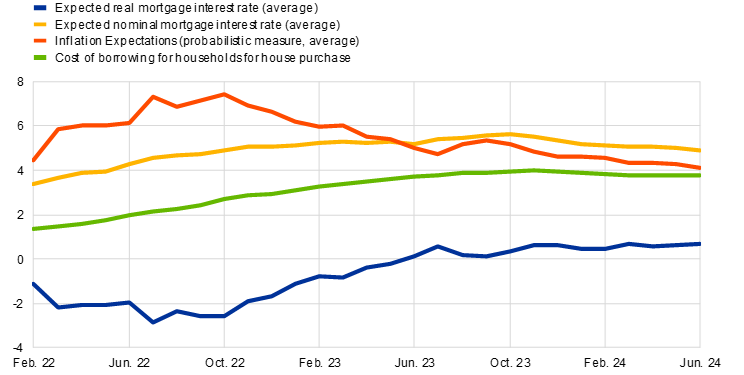 Notes The actual cost of borrowing for house purchase is measured as the euro area average interest rate for households for housing loans, only considering new business (available from SDW: MIR.M.U2.B.A2C.AM.R.A.2250.EUR.N). Weighted estimates for CES. Each month, the CES elicits a generic interest rate expectation by asking: “In 12 months from now, what do you think will be the interest rate on mortgages in the country you currently live in?”. Inflation expectations are measured as average implied mean from a beta distribution fitted to consumers probabilistic forecasts. The average real (mortgage) interest rate is calculated as the average difference between the nominal (mortgage) interest rate and the mean of the individual inflation forecast distribution. Real interest rate expectations have been winsorised at the most extreme five percent to account for outliers.