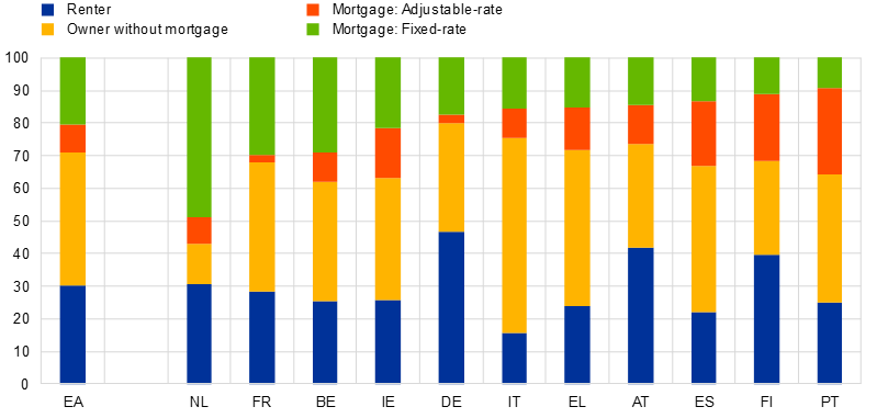 Because of these differences across the euro area, the transmission of monetary policy decisions has likely been faster in countries with a larger share of adjustable-rate mortgages and slower in those countries with a less rate-dependent housing structure. Homeowners without a mortgage, who are for example much more common in Italy than in the Netherlands, are not directly affected by changes to interest rates via their home financing but may be indirectly affected by the impact of higher rates on their wealth (e.g. if house prices decline). Renters, who are much more prevalent in Germany than in Spain, are also not directly affected by higher mortgage repayments due to changing interest rates, although there may be an indirect effect if landlords raise rents because they themselves have a mortgage.