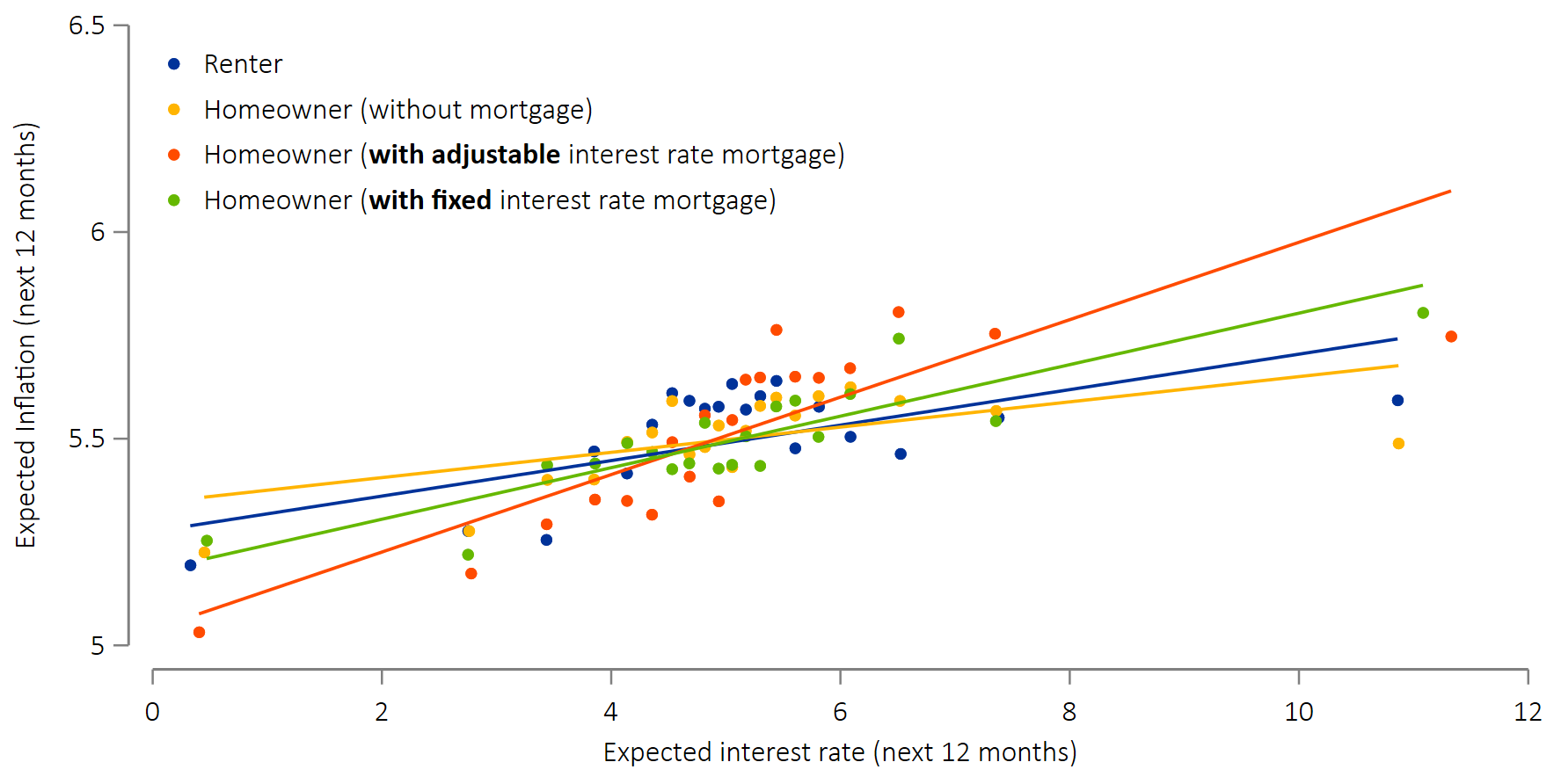 So, what is the perceived connection between consumers’ expectations about inflation and their expectations about interest rates? Survey participants who expect relatively higher interest rates generally also expect relatively higher inflation rates over the next twelve months (Chart 3). This suggests that consumers don’t necessarily expect higher interest rates during a period of monetary policy tightening to lead to lower inflation, at least not in the short term. One potential explanation for this positive association is that consumers might also expect lenders to increase interest rates to compensate for inflation in their lending activities. A different possible reason for this positive association is the role of rate-sensitive mortgage payments, which may have a direct impact on consumers’ living expenses and raise their inflation expectations.[3] In other words, higher interest rate expectations may be a source of broader concerns about the cost of living, which are in turn reflected in inflation expectations. This alternative explanation is supported by the fact that the positive relationship between nominal interest rate expectations and inflation expectations is strongest for consumers who hold an adjustable-rate mortgage and are therefore most exposed to changes in interest rates (Chart 3, red line).