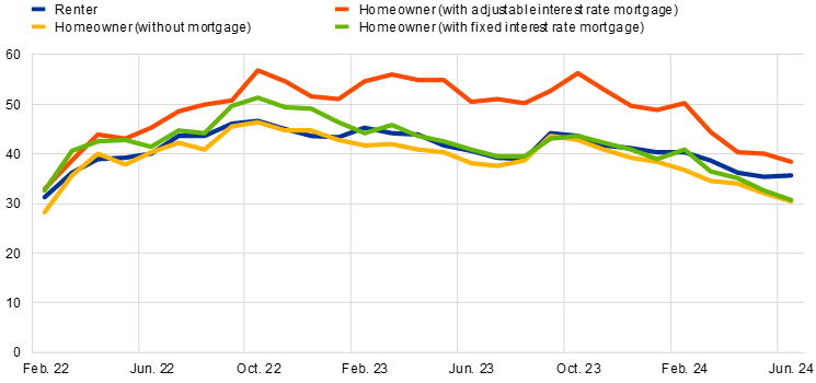 The role of housing in the transmission of monetary policy is also reflected in a growing divergence in how households perceive their financial situation today compared to 12 months ago depending on their housing situation, and in particular on the nature of their mortgage contract. The share of households that see their financial situation as worsening has steadily declined as inflation has fallen from its peak in late 2022. The CES data also highlight, however, that consumers with adjustable-rate mortgages are consistently much more likely to see their financial situations as getting worse (orange line in Chart 4). In addition, some households have also been struggling to service their mortgage payments. When the level of short-term interest rates peaked in October 2023 about 15% of adjustable-rate mortgage holders participating in the CES expected to be late with their mortgage payments over the next 12 months. This contrasts sharply with the 5.8% of fixed-rate mortgage holders with the same expectation.