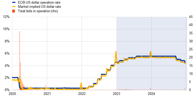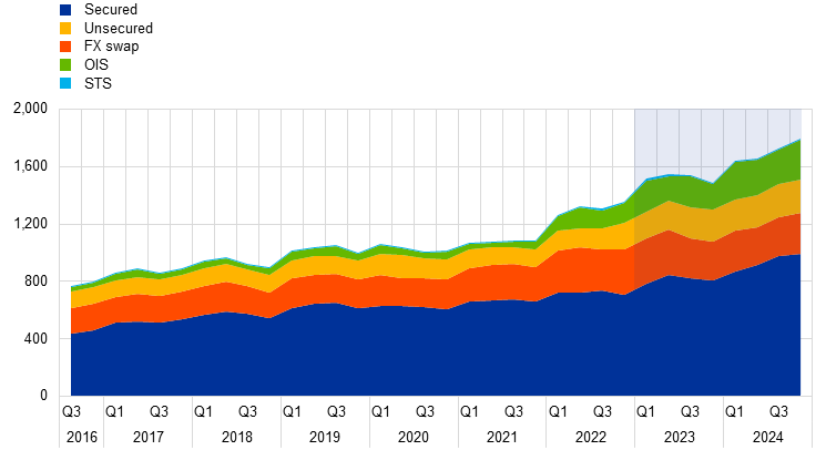 The 2024 Euro money market study provides a comprehensive analysis of euro money markets using trade data from the 45 largest euro area banks. It examines five key segments of the euro money markets: (i) secured transactions – repurchase agreements (repos) and reverse repos, (ii) unsecured cash transactions, (iii) short-term securities issuance, (iv) foreign exchange swaps, and (v) overnight index swaps. The study describes developments in these segments between January 2023 and December 2024 based on daily money market trades reported to the European Central Bank via the Eurosystem’s money market statistical reporting (MMSR) dataset.