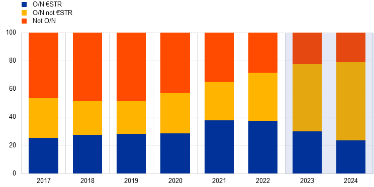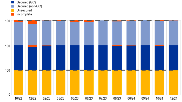 The MMSR reporting agents cover the largest euro area banks. Initially, 53 banks were reporting agents, but over time, this number had fallen to 46 because of mergers and administrative changes. On 1 July 2024, 24 new banks were added and one removed. Data from these newly added banks are excluded from this 2024 edition of the Euro money market study as their reporting only covers the last quarter of the review period (2023-2024). Reporting agents are listed in Figure A.[9]