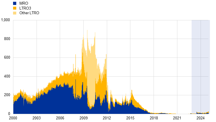 Notes: MRO = one-week liquidity-providing operations in euro; LTRO3 = three-month liquidity-providing operations in euro; Other LTRO = one-month, six-month and 12-month liquidity-providing operations in euro.