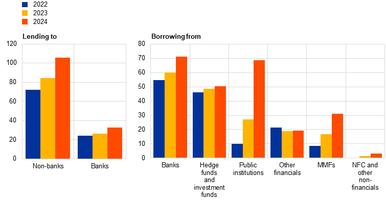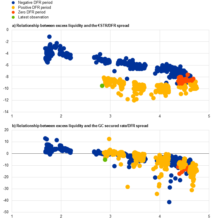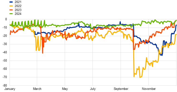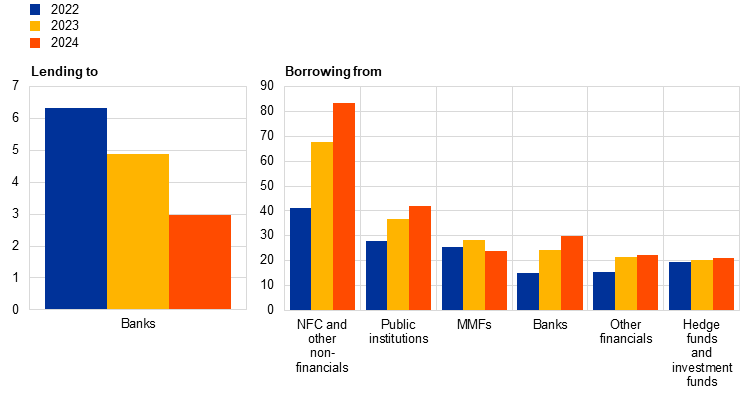 Rate convergence towards the deposit facility rate (DFR). The spread between euro money market rates and the DFR narrowed, with a more pronounced effect on secured than unsecured rates. The rise in secured rates is mainly a result of increased net collateral supply and shifts in interest rate expectations, prompting market participants to take short positions in the period 2022-2023 and then move to long positions in 2024. The impact on short-term money markets of less ample reserves and adjustments to the ECB operational framework has been limited so far (Chart 4).