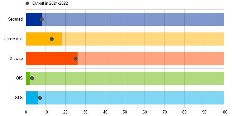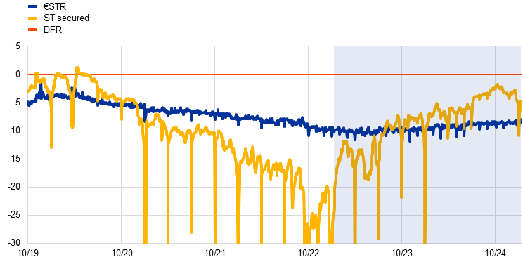 On 8 September 2022, the ECB temporarily removed the 0% interest rate ceiling for government deposits held with the Eurosystem, setting the ceiling at the DFR or the €STR, whichever was lower, until 30 April 2023. This measure aimed to prevent an abrupt outflow of deposits into the market, which would increase excess liquidity during a period of severe collateral scarcity in some euro area repo market segments, potentially pushing rates further down as policy rates rose.