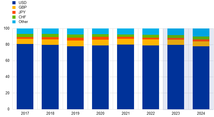 The dynamics of the FX swap market highlighted the significant impact of policy rate changes and liquidity conditions on currency interactions. During the review period, the breach of covered interest parity (CIP)[4] declined, approaching zero for shorter maturities (Chart 14, panel a). This trend was influenced by the convergence of policy rate spreads and by the ample liquidity conditions in both currencies. In the period 2023-2024, the policy rate divergence decreased from 237.5 to 137.5 basis points. In terms of liquidity, the ECB reduced its balance sheet to almost pre-COVID-19 levels, while the Federal Reserve System’s quantitative tightening was slower. This divergence in the pace of quantitative tightening led to a relative abundance of US dollar reserves compared with euros, intensifying the tightening pressure on the FX swap basis (Chart 14, panel b).[5]