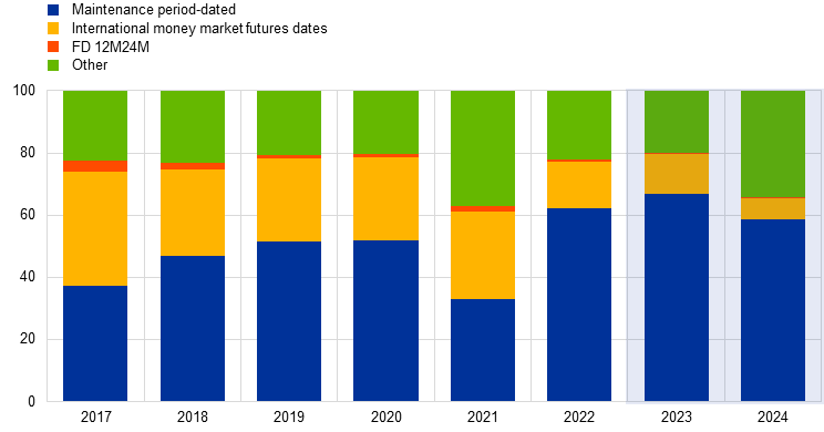 As much as 78% of OIS turnover involved forward contracts. In 2024, 60% of forward contracts aligned with euro area reserve maintenance periods and ECB Governing Council meeting dates, enabling hedging against policy rate changes. The volume of OIS trading was sensitive to signals about future rate paths from ECB press conferences and inflation flash estimates, resulting in higher trading volumes on those dates compared with the average. Contracts with original maturities over one year accounted for 51% and 49% of the outstanding amounts in spot and forward contracts respectively.