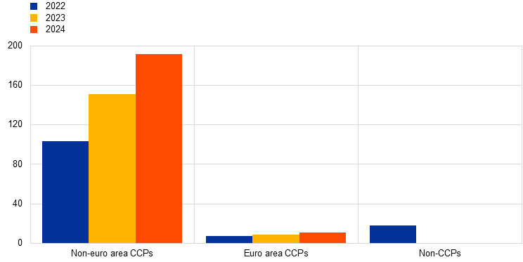 Most OIS transactions were centrally cleared, in compliance with the requirements under the European Market Infrastructure Regulation (EMIR)[7]. One non-euro area CCP cleared most trades, while euro area CCPs accounted for 6% of the total. The segment is highly concentrated, with the top ten and 150 making up 95% and 99.6% of the market respectively. Euro area banks were more active in forward than in spot positions, implying more focus on speculation than on hedging.