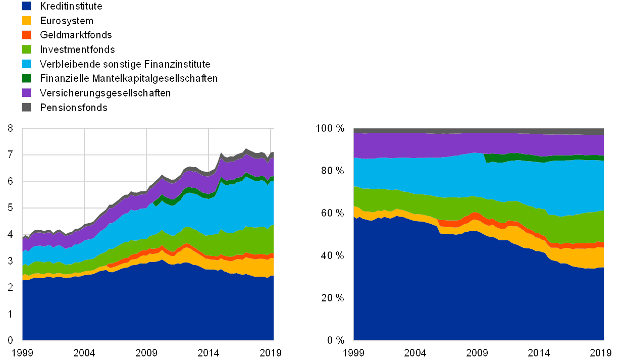 Quelle: EZB.Anmerkung: Die aggregierten (nicht konsolidierten) Vermögenswerte der Teilsektoren umfassen finanzielle Vermögenswerte, aber keine nichtfinanziellen Vermögenswerte. Zu den verbleibenden sonstigen Finanzinstituten zählen u. a. Wertpapier- und Derivatehändler, finanzielle Kapitalgesellschaften, die Kredite gewähren (wie Leasing- und Factoringgesellschaften), spezialisierte finanzielle Kapitalgesellschaften (darunter Wagniskapital-Beteiligungsgesellschaften, Export-/Importfinanzierungsgesellschaften oder einige zentrale Kontrahenten), Kredit- und Versicherungshilfstätigkeiten (darunter beispielsweise Vermögensverwaltungsgesellschaften, Wertpapierbroker, Anlageberater, Versicherungsmakler oder Börsen) sowie firmeneigene Finanzierungseinrichtungen und Kapitalgeber (darunter beispielsweise Finanzholdinggesellschaften, Finanzierungsinstrumente nichtfinanzieller Kapitalgesellschaften – z. B. zur Unterstützung ihrer Schuldverschreibungsemissionen – und sonstige Unternehmen, die Finanzströme innerhalb nichtfinanzieller Kapitalgesellschaften steuern). Daten zu Geldmarktfonds werden erst seit dem 1. Quartal 2006 separat von den Kreditinstituten gemeldet. Daten zu finanziellen Mantelkapitalgesellschaften (d. h. Unternehmen, die Verbriefungsgeschäfte durchführen) werden seit dem Schlussquartal 2009 separat von den verbleibenden sonstigen Finanzinstituten gemeldet.