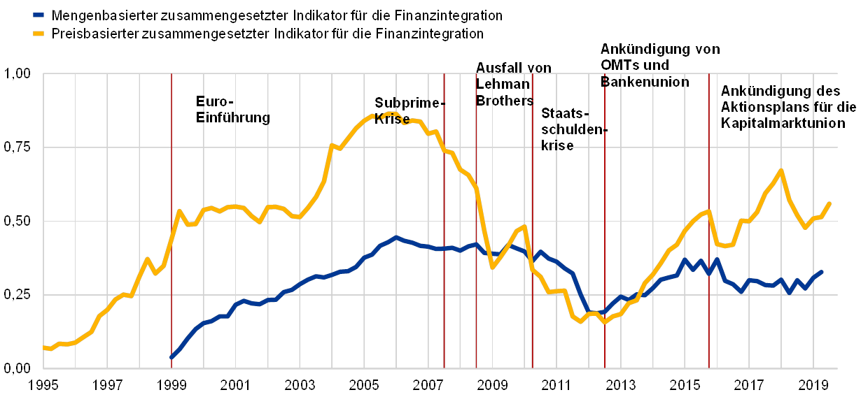 Quelle: EZB und EZB-Berechnungen.Anmerkung: Der preisbasierte zusammengesetzte Indikator umfasst zehn Indikatoren für Geld-, Anleihe- und Aktienmärkte und das Privatkundensegment im Bankenmarkt, im mengenbasierten zusammengefassten Indikator sind fünf Indikatoren für die gleichen Marktsegmente mit Ausnahme des Letztgenannten gebündelt. Die Begrenzungen der Indikatoren sind 0 (vollständige Fragmentierung) und 1 (vollständige Integration). Zunahmen bei den Indikatoren signalisieren eine stärkere Finanzintegration. Ab Januar 2018 könnte es beim preisbasierten Indikator aufgrund des Übergangs von EONIA- zu €STR-Zinsen in der Geldmarktkomponente zu Verhaltensänderungen gekommen sein. „OMT“ steht für „Outright Monetary Transactions“, also geldpolitische Outright-Geschäfte. Eine ausführliche Beschreibung der Indikatoren und der in sie einfließenden Daten findet sich im Statistical Web Annex zu diesem Bericht sowie in P. Hoffmann, M. Kremer und S. Zaharia, „Financial integration in Europe through the lens of composite indicators“, Working Paper Series der EZB, Nr. 2319, September 2019.