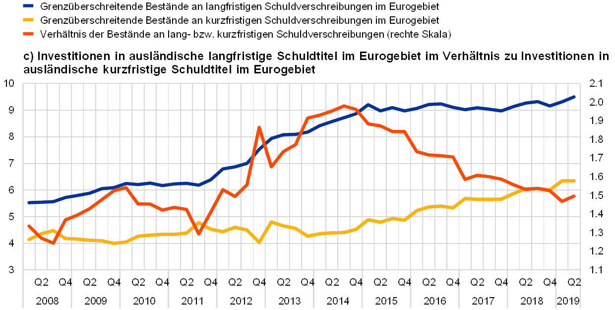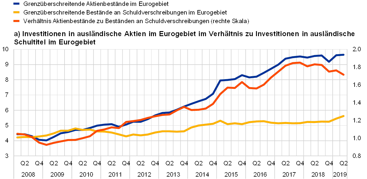 Quellen: a) EZB und EZB-Berechnungen, b) EZB, c) EZB, EZB-Berechnungen auf Grundlage von Zahlungsbilanzdaten und Eurostat, d) EZB.Anmerkung: a) Die blaue Linie zeigt den Gesamtbetrag der von Anlegern im Eurogebiet (alle Sektoren) gehaltenen Aktien, die von Gebietsansässigen anderer Euro-Länder begeben wurden. Die gelbe Linie zeigt den Gesamtbetrag der von Anlegern im Eurogebiet (alle Sektoren) gehaltenen Schuldverschreibungen, die von Gebietsansässigen anderer Euro-Länder begeben wurden. Die orangefarbene Linie zeigt das Verhältnis der beiden. Sowohl bei Investitionen in Aktien als auch in Schuldtitel bezieht sich der Gesamtbetrag auf die Summe der grenzüberschreitenden und inländischen Vermögensbestände innerhalb des Eurogebiets. b) Die blaue Linie illustriert den Gesamtbetrag der ausländischen Direktinvestitionen im Eurogebiet. Die gelbe Linie veranschaulicht die Summe der ausländischen Direktinvestitionen und der grenzüberschreitenden Portfolioinvestitionen im Eurogebiet. Die orangefarbene Linie zeigt das Verhältnis der beiden. c) Die blaue Linie zeigt den Gesamtbetrag der langfristigen Schuldtitel (mit einer Laufzeit von über einem Jahr), die von Ländern des Eurogebiets begeben und von Gebietsansässigen anderer Euro-Länder gehalten wurden. Die gelbe Linie zeigt den Gesamtbetrag der kurzfristigen Schuldtitel (mit einer Laufzeit von unter einem Jahr), die von Ländern des Eurogebiets begeben und von Gebietsansässigen anderer Euro-Länder gehalten wurden. Die orangefarbene Linie zeigt das Verhältnis der beiden. d) Die blaue Linie veranschaulicht den Gesamtbetrag der grenzüberschreitenden Vergabe von Bankkrediten an private Haushalte und NFCs innerhalb des Eurogebiets, d. h. das Kreditgeschäft der Banken mit Privatkunden. Die gelbe Linie zeigt den Gesamtbetrag der grenzüberschreitenden Kreditvergabe innerhalb des Eurogebiets zwischen MFIs, d. h. Interbankenkredite. Die orangefarbene Linie zeigt das Verhältnis der beiden. Nähere Ausführungen zur Interpretation dieser Indikatoren finden sich in Special Feature A „Financial integration and risk sharing in a monetary union“ des EZB-Berichts „Financial integration in Europe“ aus dem Jahr 2016.