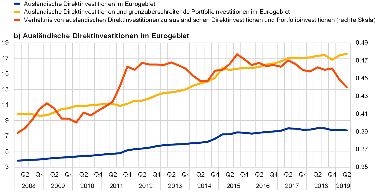 - [5]Allerdings könnte dies zum Teil der Rückführung von im Ausland erzielten Einnahmen durch multinationale US-Unternehmen geschuldet sein. Sie vollzog sich in etwa zur gleichen Zeit und könnte auch Messgrößen zu den Strömen ausländischer Direktinvestitionen innerhalb des Eurogebiets beeinflusst haben.