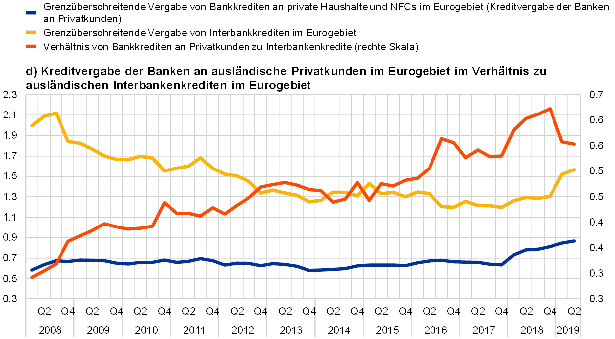 Die spürbaren Verbesserungen, die im Euroraum nach der Krise hinsichtlich der Widerstandsfähigkeit der Finanzintegration erzielt wurden, haben sich möglicherweise abgeschwächt. Daher muss überwacht werden, ob aus der Zunahme der grenzüberschreitenden Investitionen in kurzfristige Schuldtitel und dem Rückgang der grenzüberschreitenden ausländischen Direktinvestitionen – sollten diese andauern – im Zeitverlauf Anfälligkeiten gegenüber Schocks erwachsen. Abbildung 1.4 zeigt die vier Indikatoren, die die EZB zur Bewertung der Widerstandsfähigkeit der Finanzintegration im Eurogebiet überwacht. Unter Widerstandsfähigkeit versteht man in diesem Kontext, dass die seit der Finanz- und Staatsschuldenkrise bei der Finanzintegration erzielten Verbesserungen beim Eintreten schwerer Schocks nicht zunichte gemacht werden. Eine Anfälligkeit könnte sich z. B. aus überproportionalen Anteilen an kurzfristig veräußerbaren Instrumenten wie Interbankenkrediten oder kurzfristigen Schuldverschreibungen ergeben. Grafik a) in Abbildung 1.4 könnte darauf hindeuten, dass das Verhältnis zwischen grenzüberschreitenden Kapitalanlagen und grenzüberschreitenden Investitionen in Anleihen im Eurogebiet in den Jahren 2017 und 2018 seinen Höchststand erreicht hat. Grafik b) ist zu entnehmen, dass sich der Anteil der ausländischen Direktinvestitionen an den grenzüberschreitenden Direktinvestitionen und Wertpapieranlagen in Aktien im Euroraum seit 2011 auf einem ähnlichen Niveau bewegte, bevor gegen Ende 2018 ein Rückgang einsetzte.[5] Grafik c) veranschaulicht, dass Investitionen in grenzüberschreitende kurzfristige Schuldtitel im Eurogebiet seit 2014 ein schnelleres Wachstum verbuchen konnten als Investitionen in grenzüberschreitende langfristige Schuldtitel. Grafik d) zeigt, dass im Euroraum im Verlauf des Jahres 2019 der recht verhaltene Anstieg des grenzüberschreitenden Kreditgeschäfts der Banken mit Privatkunden durch die Erholung bei den grenzüberschreitenden Interbankenkrediten mehr als ausgeglichen wurde. Wenngleich die Umkehrungen in der Regel nach wie vor eher gering sind und – vielleicht mit Ausnahme kurzfristiger Schuldtitel – bis dato noch nicht besonders lange anhalten, erscheint es dennoch ratsam, die Entwicklungen bei diesen Indikatoren für die Widerstandsfähigkeit weiter zu überwachen.