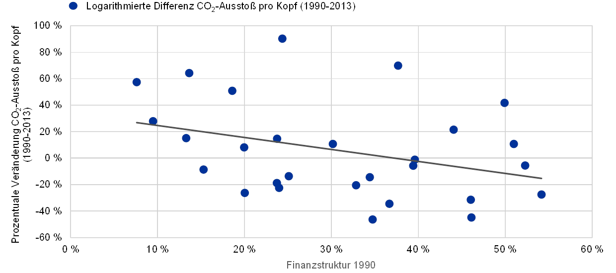 Quellen: Die Daten zu den CO2-Emissionen (Kilotonnen CO2 pro Kopf) stammen von der Internationalen Energieagentur (IEA). Die Daten zu den privaten Krediten und der Aktienmarktkapitalisierung stammen aus der World Bank Financial Structure Database.Anmerkung: Die „Finanzstruktur im Jahr 1990“ ist definiert als gesamte Aktienmarktkapitalisierung dividiert durch die Summe der gesamten privaten Kredite und der gesamten Aktienmarktkapitalisierung multipliziert mit 100 für jedes Land im Jahr 1990. Die Punkte in der Abbildung beziehen sich auf 28 OECD-Länder.