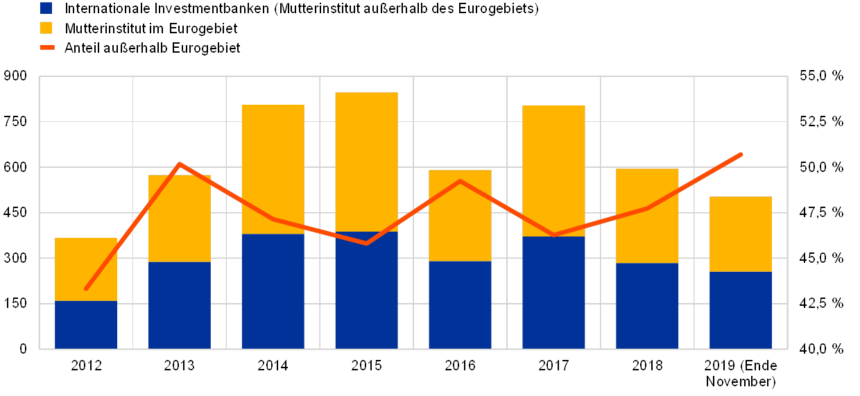 Quelle: Dealogic.Anmerkung: Banken, die als Manager, Co-Manager, Bookrunner, Underwriter oder anderweitig an Geschäften beteiligt sind, werden je nach Standort des Mutterunternehmens den Kategorien „Euroraum“ oder „global“ zugeordnet. Vor dem Brexit hatten globale Banken in der Regel von London aus Zugang zum Markt. Die Balken zeigen die Anzahl der Geschäfte, an denen einzelne Banken beteiligt sind. Da üblicherweise viele Banken an einem einzigen Geschäft beteiligt sind, kann dies zu einer gewissen Doppelerfassung von Geschäften auf der linken Achse führen. Die orangefarbene Linie zeigt das Verhältnis zwischen den blauen und gelben Balken und kann als Näherungswert für die Bedeutung globaler Banken für den Markt des Euroraums herangezogen werden.