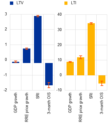 A regression analysis indicates that lending standards tend to loosen during the expansionary phase of the cycle and tighten in downturns. Estimates based on a panel of loan-level data for seven euro area countries[5] reveal a positive and statistically significant relationship between lending standards and macroeconomic variables that proxy for the economic and financial cycle (Chart 1, panel a). In particular, a one-standard-deviation increase in GDP growth, RRE price growth and measures of cyclical risks (i.e., the systemic risk indicator (SRI))[6] is associated with an increase in LTVs at origination of 0.08, 0.9 and 3.08 percentage points respectively. Similar results hold for LTIs at origination: a one-standard-deviation increase in GDP growth, RRE price growth and the SRI is associated with an increase in LTIs at origination of 8, 11 and 34 percentage points respectively. The impact of short-term policy rates (proxied by the three-month overnight index swap (OIS) rate) goes in the opposite direction. A one-standard-deviation increase in the OIS rate results in a 1.4 (5.3) percentage-point decrease in LTVs (LTIs) at origination, as the standard balance sheet channel of monetary policy transmission would predict.[7] Consequently, lending standards tend to loosen during upswing phases of the RRE cycle (Chart 1, panel b). On average, during RRE price booms[8], LTVs (LTIs) at origination were around 4 (16) percentage points higher than during periods of lower or moderate RRE price growth.[9]