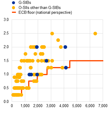 The BU perspective is implemented as a minimum standard, the BU floor. This floor is applied to all O-SIIs as designated by national authorities in the banking union. Similarly to the existing ECB floor, the G-SIB methodology and most national O-SII methodologies, a bucketing approach is used rather than a continuous function, in order to limit the volatility of the resulting minimum buffer rates.