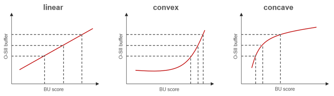 The relationship between O-SII score from the BU perspective and O-SII buffers could take various shapes. When buffer increases from one bucket to the next are in constant steps, the shape of the relationship implies a constant bucket size for the linear shape, a decreasing size for the convex shape and an increasing size for the concave shape (Figure 1). While many countries assume a linear or concave relationship between O-SII scores and buffers, the G-SIB framework assumes a linear relationship for the score range that is currently populated by G-SIBs, followed by a bigger step size of 1 percentage point rather than 0.5 percentage points between the last populated bucket and the empty bucket, which introduces some convexity into the overall shape.