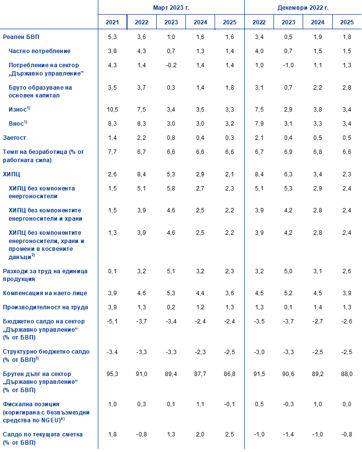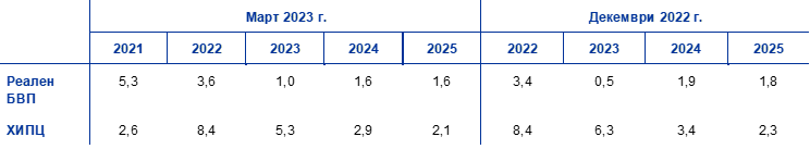 В съпоставка с прогнозите от декември 2022 г. прирастът на реалния БВП е ревизиран нагоре с 0,5 процентни пункта за 2023 г. и надолу с 0,3 процентни пункта за 2024 г. и 0,2 процентни пункта за 2025 г. Възходящата ревизия за 2023 г. отразява положителен инерционен ефект от изненадващо добрите данни през втората половина на 2022 г., главно благодарение на по-ниското търсене на внос на енергоносители, както и възходяща ревизия на краткосрочната перспектива. Последната е обусловена от по-бързо от очакваното приспособяване на енергийния пазар и на значително отслабване на инфлацията на енергоносителите, свързания с това спад на несигурността и подобряване на доверието, както и от бързо преодоляване на затрудненията във веригите на доставка. Отвъд краткосрочния хоризонт растежът на БВП е ревизиран надолу за 2024–2025 г. поради по-силен ефект от затягането на паричната политика, което води до възходяща ревизия на лихвените проценти, неотдавнашното рязко затягане на условията за предлагане на кредити и повишаването на обменния курс на еврото. Те надделяват над положителните ефекти от по-ниската инфлация върху доходите и доверието.