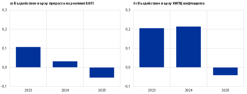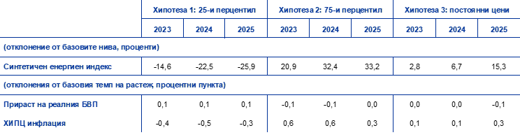 Въздействието на тези алтернативни хипотези се оценява с помощта на редица макроикономически модели на експерти на Евросистемата и ЕЦБ въз основа на синтетичен индекс за енергията. В таблицата по-долу е показано средното въздействие върху прираста на реалния БВП и инфлацията при тези модели. Резултатите за 75-ия перцентил сочат възходящо отклонение от базовата прогноза за ХИПЦ инфлацията от 0,6 процентни пункта през 2023–2024 г. и 0,3 процентни пункта през 2025 г. Сценарият, основаващ се на постоянна тенденция на цените, показва по-малки въздействия през 2023–2024 г., но подобно възходящо отклонение за ХИПЦ инфлацията през 2025 г. За разлика от това при сценария, която се основава на 25-ия перцентил, въздействието върху ХИПЦ инфлацията възлиза на -0,4, -0,5 и -0,3 процентни пункта съответно за 2023 г., 2024 г. и 2025 г. Въздействието върху прираста на реалния БВП е в размер на -0,1 процентни пункта през 2023 г. и 2024 г. при 75-ия перцентил, а при 25-ия перцентил прирастът на БВП е с 0,1 процентни пункта по-висок през всяка от годините от прогнозния период. Допускането за постоянна ценова динамика би имало пренебрежимо малко въздействие върху БВП през целия прогнозен период.