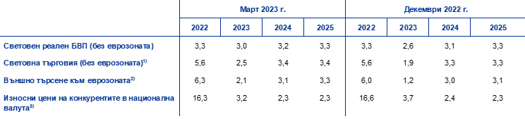 Крайната дата за техническите допускания, като например за цените на петрола и обменните курсове, е 15 февруари 2023 г. Прогнозите за световната икономика са завършени на 16 февруари, а макроикономическите прогнози за еврозоната – на 1 март 2023 г. Данните за минали периоди за еврозоната включват и Хърватия за всички променливи с изключение на хармонизирания индекс на потребителските цени (ХИПЦ). Настоящите прогнози обхващат периода 2023–2025 г. Прогнози с толкова дълъг хоризонт са свързани с много висока степен на несигурност и това следва да се има предвид при тълкуването им. Вижте статията The performance of the Eurosystem/ECB staff macroeconomic projections from the financial crisis („Резултатност на макроикономическите прогнози на експертите на Евросистемата/ЕЦБ след финансовата криза“), Икономически бюлетин, брой 8, ЕЦБ, 2019 г. Базисните данни в таблиците и графиките са публикувани в удобен за използване формат на http://www.ecb.europa.eu/pub/projections/html/index.bg.html. Пълна база данни на предишни макроикономически прогнози на експертите на ЕЦБ и Евросистемата е налична на адрес https://sdw.ecb.europa.eu/browseSelection.do?node=5275746.