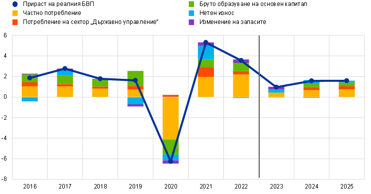 Икономическият растеж в еврозоната се забави чувствително през втората половина на 2022 г. и в крайна сметка отбеляза застой през четвъртото тримесечие.[1] Въпреки това благодарение на по-сигурните енергийни доставки цените на енергоносителите намаляха значително, доверието се подобри, а икономическата активност би трябвало леко да се засили в краткосрочен план. В момента по-ниските цени на енергията осигуряват известно намаляване на разходите, особено за енергоемките отрасли, а затрудненията в глобалните вериги на доставка са в голяма степен преодолени. Възстановяването на равновесието на енергийния пазар се очаква да продължи, а реалните доходи – да се увеличат. При условие че външното търсене също се засили, а напрежението на финансовите пазари отзвучи, се очаква растежът на производството да се възобнови от средата на 2023 г., подпомогнат от силния пазар на труда. Въпреки това протичащото нормализиране на политиката на ЕЦБ и очакваното от пазарите допълнително увеличение на лихвените проценти ще намират все по-голямо отражение в реалната икономика. Неотдавнашното затягане на условията за предлагане на кредити също ще окаже сдържащ ефект. Тези фактори, наред с постепенното оттегляне на фискалната подкрепа и някои непреодолени опасения за рисковете за енергийните доставки през следващата зима, ще потискат икономическия растеж в средносрочен план. Като цяло средният годишен растеж на реалния БВП се очаква да се забави до 1,0% през 2023 г. (от 3,6% през 2022 г.), след което да се възстанови до 1,6% през 2024 г. и 2025 г. В сравнение с макроикономическите прогнози на експертите на Евросистемата от декември 2022 г. перспективата за растежа на БВП за 2023 г. е ревизирана нагоре с 0,5 процентни пункта поради инерционен ефект от изненадващо положителни данни през втората половина на 2022 г. и по-добра краткосрочна перспектива. За 2024 г. и 2025 г. тя е ревизирана надолу съответно с 0,3 процентни пункта и 0,2 процентни пункта, тъй като затягането на условията за финансиране и неотдавнашното поскъпване на еврото надхвърлят положителните ефекти от по-ниската инфлация за доходите и доверието.