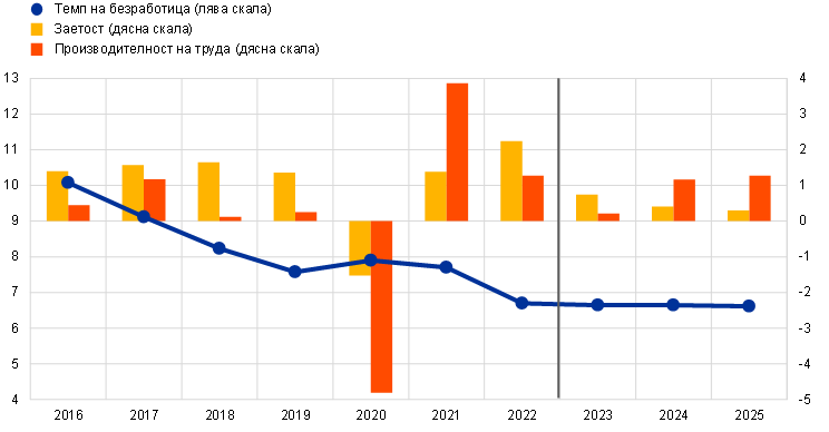Прогнозира се пазарът на труда да остане устойчив, а безработицата да се задържи на безпрецедентно ниско равнище през целия прогнозен период в условия на продължаващ недостиг на трудов ресурс (Графика 3). През четвъртото тримесечие на 2022 г. заетостта нарасна с 0,3% въпреки застоя в растежа на реалния БВП. Предвижда се тя да продължи да се увеличава през прогнозния период, макар и с по-бавен темп, отколкото през 2022 г. (0,8% през 2023 г., 0,4% през 2024 г. и 0,3% през 2025 г.). Растежът на заетостта следва спад на риска от икономическа рецесия в краткосрочен план, като забавянето на реалната икономическа активност през 2023 г. не води до увеличение на съкращенията. Вместо това то поражда усилия за запазването на работна ръка в среда на продължаващ недостиг на трудов ресурс. В резултат на това се очаква нарастването на производителността да спадне до 0,2% през 2023 г., а след това да се увеличи до 1,2% през 2024 г. и 1,3% през 2025 г. На фона на очаквано по-нататъшно леко увеличение на работната сила се предвижда темпът на безработица да остане около сегашното си равнище от 6,6% през целия прогнозен период.