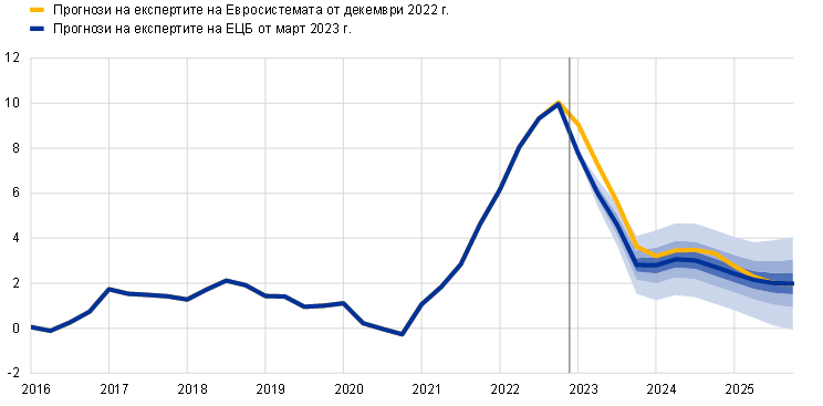 Очаква се общата инфлация да спадне значително през 2023 г., макар и да остане на повишено ниво. Това се дължи на низходящи базови ефекти, свързани с енергията, спад на цените на енергоносителите и отслабване на натиска по веригата. Би трябвало ХИПЦ инфлацията да допринесе съществено за този спад, главно поради силни низходящи базови ефекти от силното поскъпване на енергийните суровини през 2022 г. и поради постепенно отразяване на далеч по-ниските допускания за цените на петрола, природния газ и електроенергията. Съответно отслабването на инфлацията на енергоносителите в ХИПЦ през прогнозния период отразява спад във всичките ѝ основни компоненти (цени на транспортните горива, природния газ и електроенергията). Инфлацията на храните също се очаква да намалее осезаемо вследствие на отслабване на натиска по веригата. Динамиката на инфлацията в компонента на непреработените храни отслабва от миналата есен насам с отзвучаването на възходящия ценови натиск от сушата в Европа през миналото лято. Същевременно ценовият натиск от компонента на преработените храни продължава да е значителен и той оказва допълнителен натиск за повишаване на инфлацията на храните в краткосрочен план. Въпреки това в хода на 2023 г. постепенното отслабване на натиска по веригата върху потребителските цени на храните в резултат от понижаващите се допускания за изкупните цени на селскостопанската продукция, по-ниските цени на енергията и други фактори за производство в съчетание с низходящи базови ефекти би трябвало да доведе до спад на инфлацията на храните. Предвижда се ХИПЦ инфлацията без компонентите енергоносители и храни да отслабва постепенно през 2023 г., тъй като се очаква намаляването на натиска по веригата да компенсира възходящия натиск от засилващия се растеж на заплатите. По-специално, очаква се да отслабне възходящият натиск по веригата от силното поскъпване на факторите за производство и от понижаването на обменния курс на еврото в предишни периоди. За това допринасят низходящото въздействие от неотдавнашното поскъпване на еврото и по-слабите косвени ефекти предвид на доста по-ниските допускания за енергийните цени. Отслабващият натиск от затруднения във веригите на доставка в миналото би трябвало да допринесе за очаквания спад на ХИПЦ инфлацията без компонентите енергоносители и храни. Нормите на печалба, които се увеличиха през 2022 г., също се очаква да започнат да отслабват, тъй като започва да се усеща въздействието от конкурентния натиск. Спадът на ХИПЦ инфлацията без компонентите енергоносители и храни първоначално ще бъде обусловен от инфлацията на неенергийните промишлени стоки, докато по-голямото нарастване на заплатите ще доведе до по-продължителна инфлация при услугите, която се очаква да остане силна през цялата 2023 г. Промените на теглата в ХИПЦ оказаха низходящо въздействие върху ХИПЦ инфлацията без компонентите енергоносители и храни през първите месеци на 2023 г. Очаква се те да окажат възходящо въздействие през третото тримесечие, докато върху общата инфлация би трябвало да имат отрицателен ефект за 2023 г. като цяло.